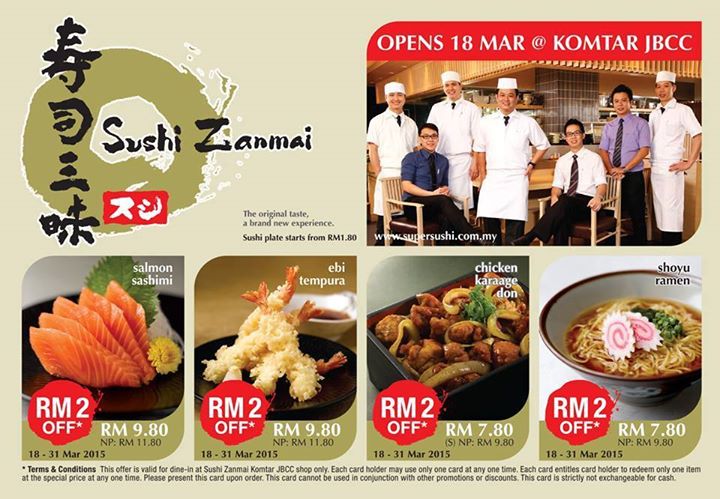 著名寿司连锁店Sushi Zanmai ▪ 终于来到新山! March 20, 2015 喜欢吃日本餐的朋友们,在新山的美食选择是越来越多了喔!现在,著名寿司连锁店Sushi Zanmai也正式进军新山,首间分店就在Komtar JBCC的Level 2,料理选择多且价格大众化。美味的生魚片、壽司、定食,实在让人欲罢不能呢!从3月18日 ~ 3月31日,指定料理还能享有RM2的折扣优惠。想要品尝美味寿司的食客们,可不要错过喔! Comments comments